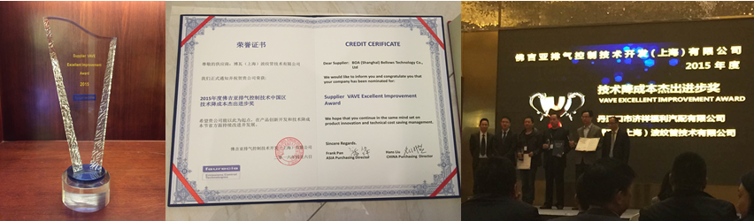 2016年4月6日,博瓦上海在佛吉亞中國召開的供應(yīng)商大會(huì)上,以杰出的產(chǎn)品性價(jià)比榮獲了“2015年度佛吉亞排氣控制技術(shù)中國區(qū) - 技術(shù)降成本杰出進(jìn)步獎(jiǎng)”,為博瓦上海所斬獲的眾多榮譽(yù)中,又增添了一份耀眼的獎(jiǎng)?wù)拢】偨?jīng)理陶寶亮親自出席并登臺(tái)領(lǐng)獎(jiǎng),充分顯示了博瓦上海公司對(duì)這一榮譽(yù)的高度重視。